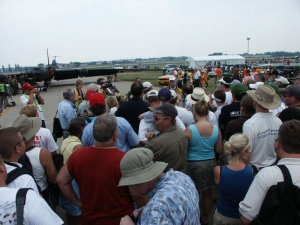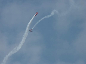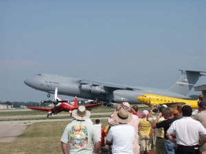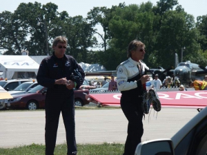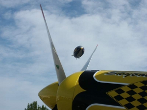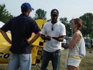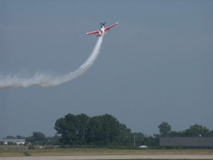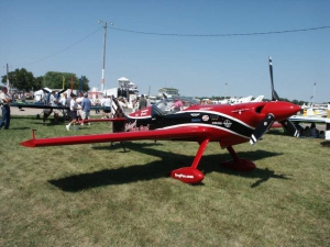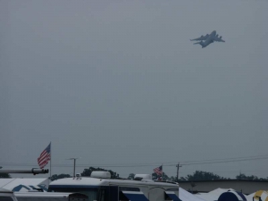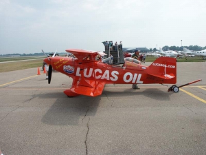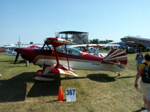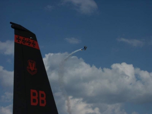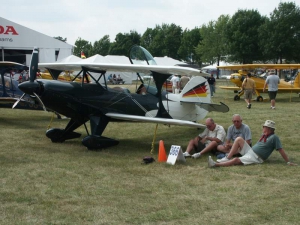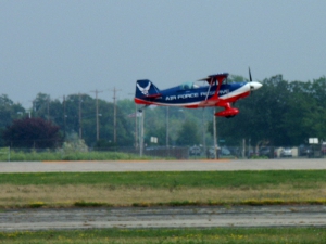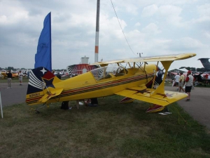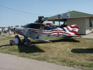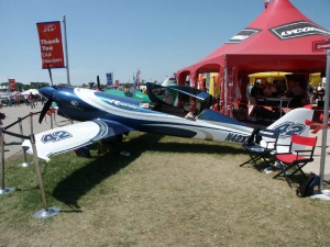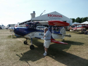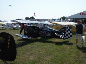Saturday was a pleasant day, weather-wise. It was also a day of highs and lows. The low came mid-day, as virtually everyone at AirVenture was shocked by the arrival of news that X-Team leader Jim LeRoy of Bulldog Airshows had died that afternoon in a crash while performing at the Dayton airshow. Jim was one of the best Pitts pilots there was, bar none, and he took airshow performances to that “next level” that few performers ever even come close to. During the Oshkosh airshow, many if not all of the acro performers certainly carried a great burden of knowing that a good friend and fellow performer was gone all too soon. We had the privilege of talking with Jim and his wonderful wife Joan and his young son Tommy during previous airshows, which personalized the tragedy to us even more. While everyone accepts that aerobatic airshow performances carry a certain amount of risk, nobody is ever truly prepared for the shock of seeing or hearing that something has goes wrong… especially when it happens to someone with immense experience and skill like Jim LeRoy. Jim leaves a great void in the aviation world that will not soon be filled. Should you wish to contribute to the fund for his young son’s college education, you can find information at the Bulldog Airshows website.