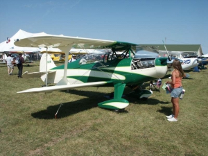 - Chris May’s gorgeous green Firebolt N4GW was in the running for the “big one”, but the bigger story is that of it’s building. Here, Chris points out to the audience that this is really George Wheeler’s plane. George built the majority of the plane along with Chris, but passed away before it flew. The Mays promised him that they’d do everything possible to get it to Oshkosh. It first flew in May, but was actually finished the Saturday before the show! A Bronze Lindy is a great testament to the quality of this aircraft… George must be looking down from somewhere, with a big old grin on his face!