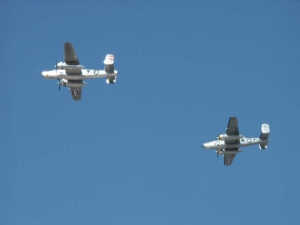 - A pair of B-25s cruise by during the warbird airshow.