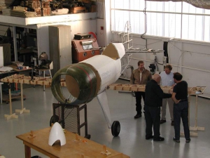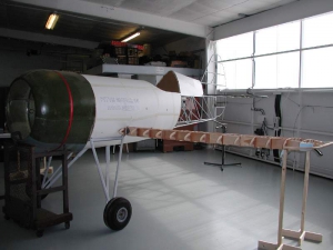 To assist with creating the side formers and the side panels, the lower wings and tail were attached to the fuselage while posterboard templates for the side panels were attached to work out the panels and how they would overlap and intersect adjoining structure. Suspending an old Yak cowl in front for fun really made it look like a Golden Age racing monoplane! Curtis visited early in the month to make progress on the upper wing center section and cabane system.