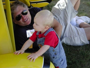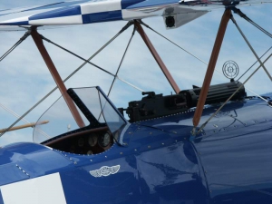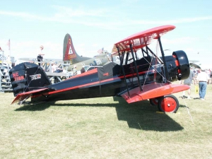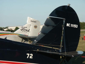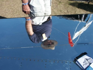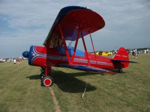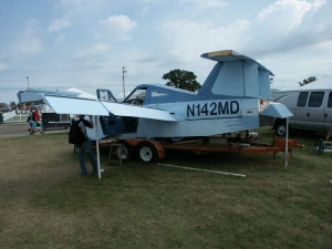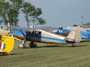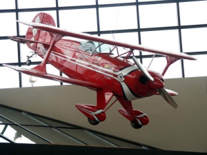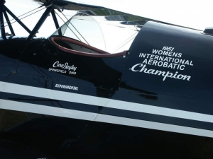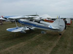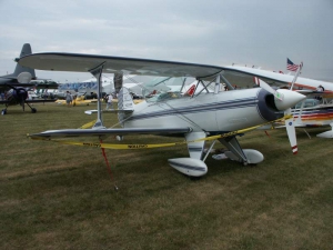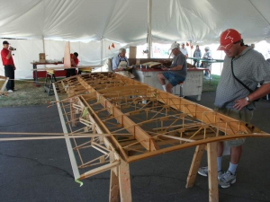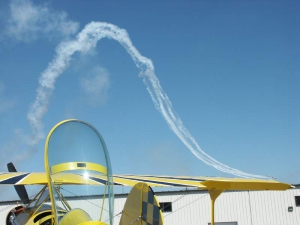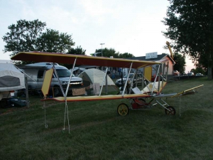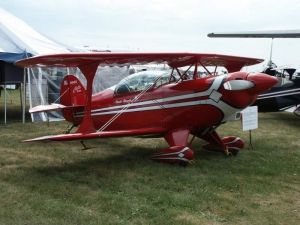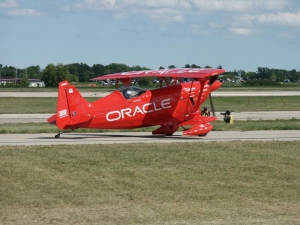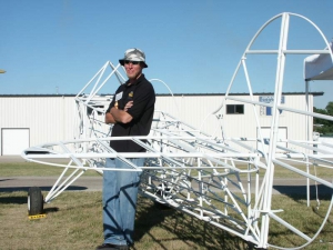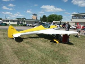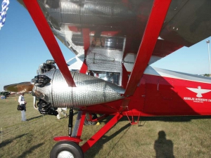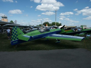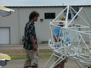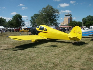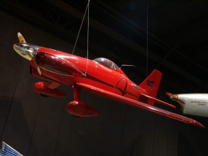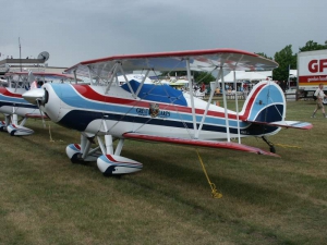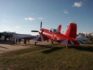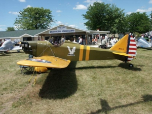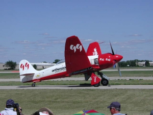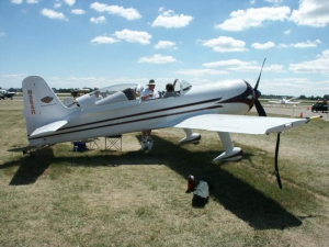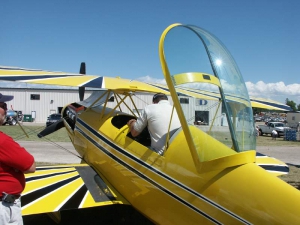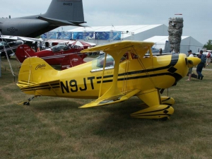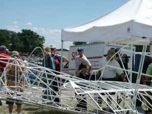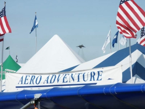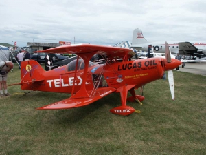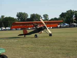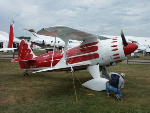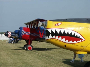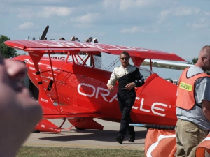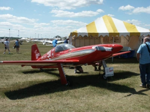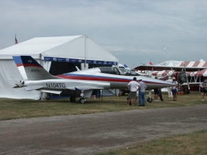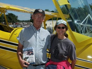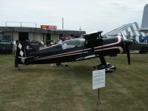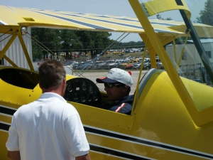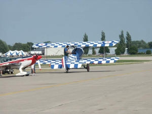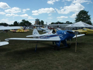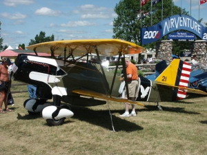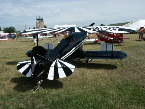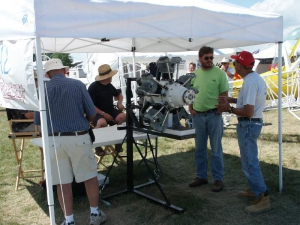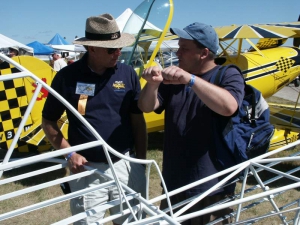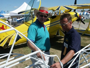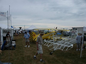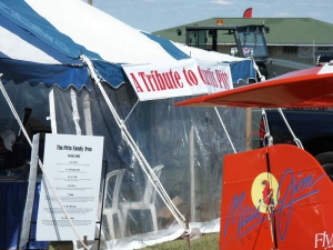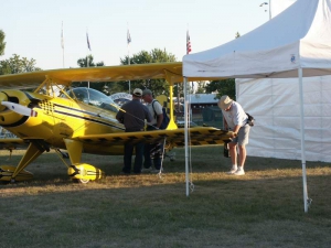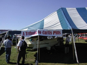 After some severe weather on Saturday, Sunday was calmer… though the heat index was 114 degrees! Everyone in our crew had arrived by Sunday, so we got busy with setting up our display (it’s in the same location as last year, between the main gate and Paul’s Park.) We were also pleased to have the opportunity to take part in a special event… Steen Aero Lab, Kevin Kimball of Jim Kimball Enterprises, author and Pitts afficianado Budd Davisson, Allan Westby of EAA, and the IAC teamed up to create a display to honor everyone’s beloved friend Curtis Pitts, who passed away in June. The tribute includes prototypes, replicas, and early copies of nearly all of Curtis’ designs, arranged around a tent, where visitors can view historical photos and read about the life of the world’s greatest aerobatic aircraft designer. The display also includes video showing the early flights of the first Pitts Special, the first S1-C N8L, and some very special (not to mention entertaining) tributes to Curtis by several well-known airshow performers. Also on display under the tent is the 1990 replica of the first Pitts Special and the first S-2 “Big Stinker”.