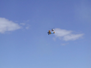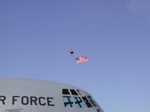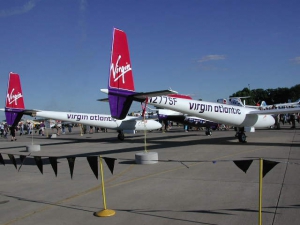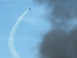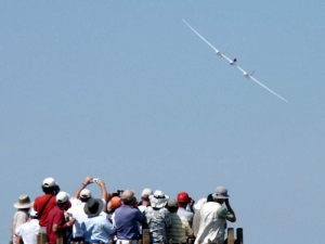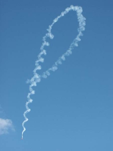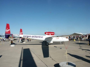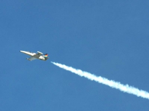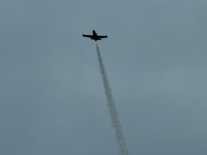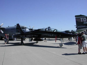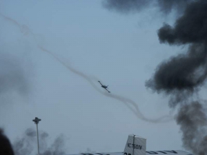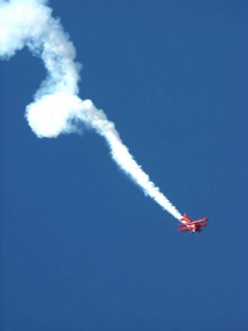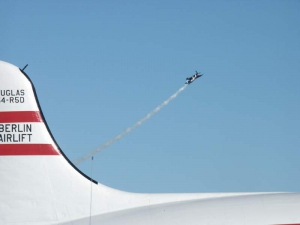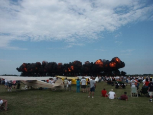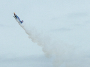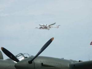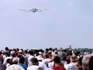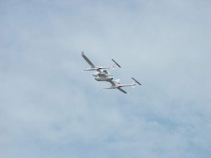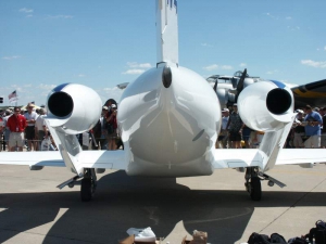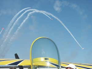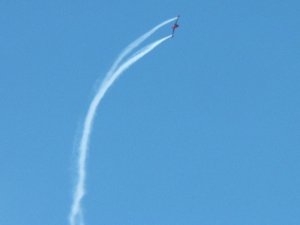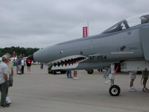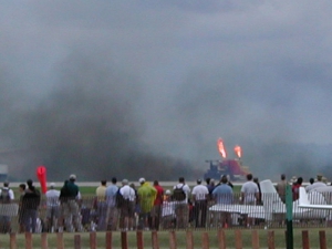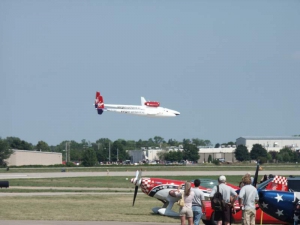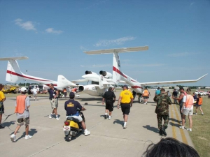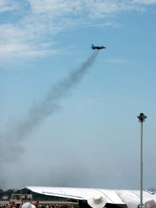 Saturday saw a lot more locals visit, but the crowds really weren’t much bigger since a lot of folks were leaving to go back home. Burt Rutan’s airplanes got a lot of flight time… both the White Knight/SpaceShipOne and the Virgin Global Flyer did flight demos, with the Global Flyer heading out after it performed some flybys. Both of these aircraft show more maneuverability than you might expect. The White Knight has afterburning engines (as Burt told the crowd, “we got them cheap on eBay!”) so it’s actually capable of climbing out quite steeply even with the extra weight and drag of SpaceShipOne underneath. The Global Flyer is quite graceful (it’s essentially a big, twin-boom powered glider) and Steve Fossett was banking it quite sharply at times and doing some really low passes. It doesn’t make a lot of noise either, probably because the turbofan is optimized for efficiency rather than raw power.