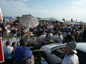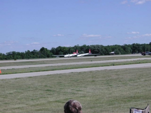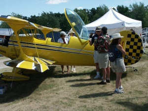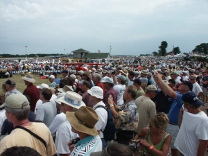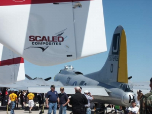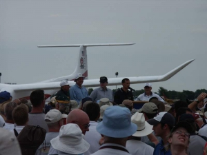Monday was a good start to the show, a little slower than in other years (since they previously started Oshkosh on Tuesday) but that should pick up as the week goes on. The weather was nice, but warm, though some bad weather started moving in very late in the day. There were a good number of folks who went through the Curtis Pitts memorial area, with many folks sharing stories of time with Curtis or his airplanes. The White Knight and SpaceShipOne arrived at 3PM, right on schedule, and really stole the show… it was a virtual mob scene… albeit an incredibly polite and nearly organized one… as thousands of admirers jockied for position to see, photograph, and meet the aircraft and the team that won the X-prize. They all signed a few autographs and had a great time, you can tell that they really enjoyed “coming home” to a bunch of EAA folks on the only public stop for SpaceShipOne before it goes into the National Air and Space Museum in Washington.