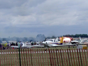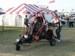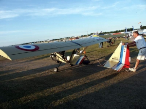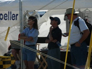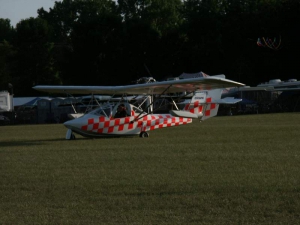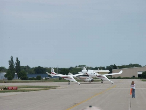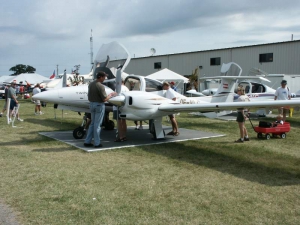 Saturday wasn’t just the Scaled Composites show, there was a ton of other stuff going on as well. We finally got to see Steve Culp fly his awesome Sopwith Pup replica, though he didn’t do any acro this time around (it’s a +/-10G airframe with 400 hp, so airshow acro is definitely in Steve’s plans!) but at least he got to “drop” some bombs. The EAA has of course put a tremendous amount of effort into the Sport Pilot rules, which were announced at Oshkosh last year. To support this effort, they had several sessions where they made it possible for attendees to get their Sport Pilot student certificates at no cost (normally, it costs about $50 to do it at the local FAA office.) The process was actually pretty easy… applicants were asked if they held any type of FAA pilot certificate and if they had any felony narcotics convictions. If the answer was no to both, and they had a government-issued photo ID, then it was just a matter of (carefully) filling out a form or two, having the certificate typed up, and getting signed off by the appropriate flight instructors. The student certificates are good for two years. Mike and Kristin Whaley took advantage of this and got their student certificates, as did at least a couple hundred other folks (just at the Saturday session, there were other sessions during the week.) We’ll have to see who actually gets their Sport Pilot certificate first! One year into the Sport Pilot rule, there are still a lot of issues to work out, such as establishing a viable training and aircraft rental infrastructure, getting the costs for new LSAs down further (many of them still cost a lot more than a good used Cherokee or Cessna 150), and resolving the infamously disappointing medical double standard issue (certificated pilots who lost their last medical due to some medical condition can’t fly until they get a valid new medical, while a new pilot with the identical condition can fly legally using only a driver’s license for their medical certification.) But the interest in SP and LSA’s remains very high and the general consensus with those involved seems to be that all of these issues will eventually be worked out in a satisfactory manner, and it’s really just a matter of how long it will take. In part, the FAA is waiting to see how things go before changing things, and the same holds true for many of the insurers, finance outfits, FBOs, etc. It’s a bit of a chicken-and-egg situation in some ways but there are some new players that aren’t entrenched in serving the “traditional” pilot community as it’s existed before Sport Pilot, who are focusing only on the SP/LSA side… this should help drag the more established players into the game as well, which will hopefully benefit all pilots by creating even more choices for aircraft, flight priveleges, and services. The wheels of governmental change grind slower than molasses in January but for the most part it looks like the FAA is actually onboard with Sport Pilot.