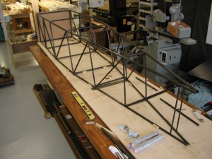 - The fuselage box is taking shape. The completed side panels are jigged level and plumb. The longerons are heated and bent inward at two stations to join at the tailpost.