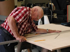 - Curtis isn’t one to just sit back and watch… here he is laying out a full size template for a construction jig. His pragmatic approach to layout and construction has been optimized over the development of many prototype aircraft.