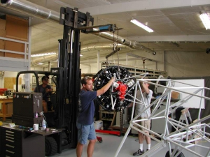 - Mike Hughes, Andy Friend and Paul Goetsch hang the engine. The bolts just slide in.