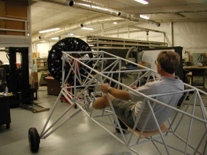 The first M14P engine from George Coy arrived in mid July, although shipping caused failure to the structure attaching the motor to the pallet (a seemingly very sturdy structure.) Fortunately, damage to the engine is minimal so we are able to forge ahead. Steve Culp (creator of the Culp Special) arrives for a week or so to help out, and among other things, he welds up the new motor mount. By the 22nd, the fuselage had gear legs, the whole structure had temporary paint to protect it from the weather, the engine had been mounted, seat backs and floor panels were installed, and the prototype was put on a trailer and wrapped up ready for the long drive to Oshkosh. Several folks have already climbed in and made airplane noises.