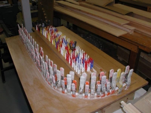 - You need a LOT of clamps to build wooden airplane wings! Here, laminated wingtip bows and laminated capstrips are being formed. (Later, we started forming the capstrips as sheets, and sawing them into strips afterwards.)