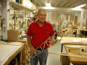 - John Hollister holds a rib in the Steen Aero woodshop… John does really nice work.